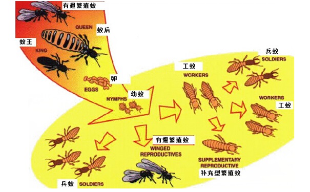 白蟻的種類有很多種,中國已知有白蟻4科、47屬、480多種,國內(nèi)28個?。ㄊ?、自治區(qū))均有分布。其中危害較嚴(yán)重的有土木棲的鼻白蟻科乳白蟻屬的家白蟻(臺灣乳白蟻)、散白蟻、土棲的黑翅大白蟻、堆砂白蟻、黃胸散白蟻等,對房屋建筑危害最嚴(yán)重的是家白蟻。